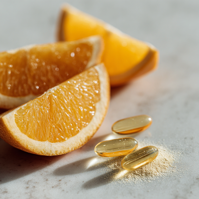 Vitamin C and Fish Collagen Peptides work together to enhance collagen synthesis, skin elasticity, and hydration for a youthful appearance, reducing fine lines.